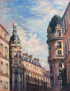 I adore the visual feast which is Paris with its distinctive historic architecture and atmosphere. While painting this I imagined all the gorgeous apartments contained within these buildings with their quintessential mansard roofs and balconies. I was inspired by all the Impressionist painters but in particular Gustave Caillebotte whose wonderful cityscapes captured the energy and architecture of his era. I've always been a fan of Caillebotte and I previously painted an homage to his great work "Paris Street, Rainy Afternoon" which can be seen here.